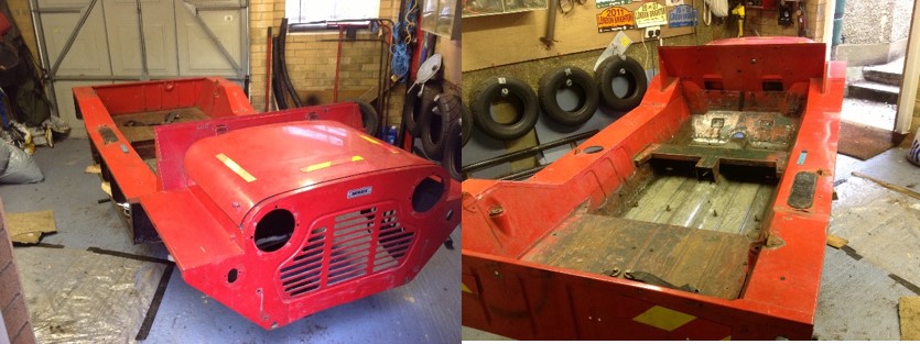 The first task was horrible, the whole of the shell had been liberally coated inside and out with a thick layer of underseal and I decided as it was so thick that it needed to come off before media blasting (to avoid overheating and warping panels.) This took weeks to do with a homemade scraper sharp enough to cut through the gunge… Eventually it was ready to go for blasting and off it all went, shell, panels, sub-frames the lot!. The sub-frames were original and in generally excellent condition so only needed one small inset patch welding on, they were blasted and then powder coated with all the various suspension bits. The tub was red oxide prime coated before return to my garage.