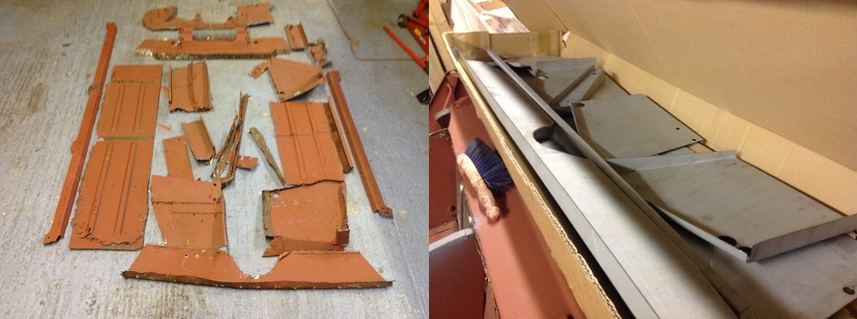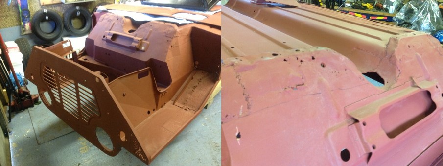So we started, with myself cutting out the bad, then Dave would come along and work for a few hours to suit his other commitments, until eventually we had repaired the shell to a solid state suitable to rebuild. This task took a few months of part time work but the end result was excellent as considerable care had been taken to re-alight the panels exactly- when the sub frames were later offered up they fitted perfectly into place!