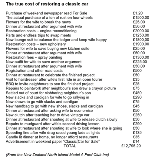 Starting with some sobering facts about classic car ownership. We are grateful to Jean Wray for providing the following (from bitter experience?!).